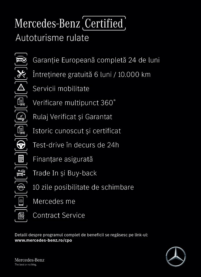 Așadar, cumpărarea unui autoturism second-hand poate fi cea mai bună alegere în momentul în care avem toate informațiile necesare, pentru a putea lua decizia potrivită. În vederea rezolvării diverselor incertitudini, Mercedes-Benz România ne sare în ajutor prin îmbunătățirea programului CPO (Certified Pre-Owned), generând astfel un standard de calitate pe care ni-l garantează printr-un pachet de 12 beneficii la achiziționarea unei mașini rulate certificate.