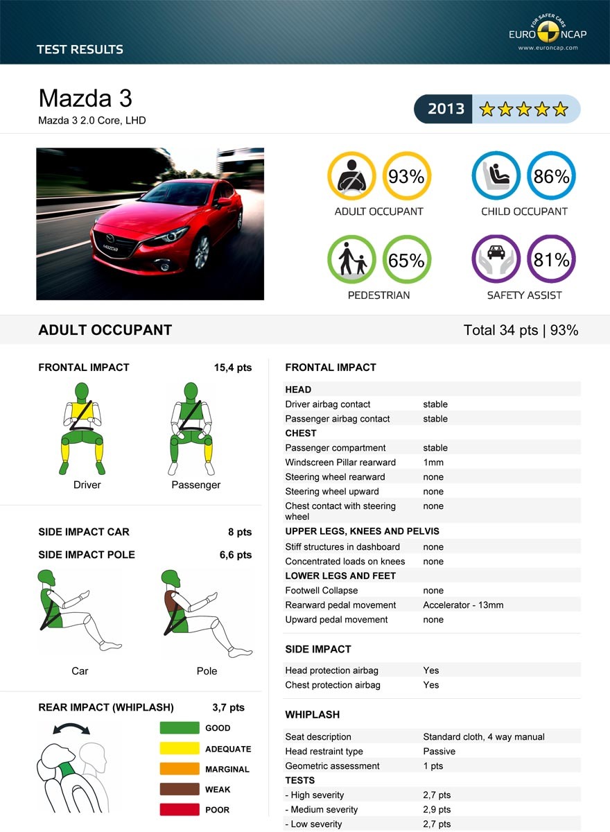 Compacta japonezilor ia, graţie tehnologiei SKYACTIV, cinci stele Euro NCAP, având calificative de la bune în sus, atât pentru protecţia pasagerilor adulţi şi a copiilor, cât şi pentru sistemel de siguranţă.