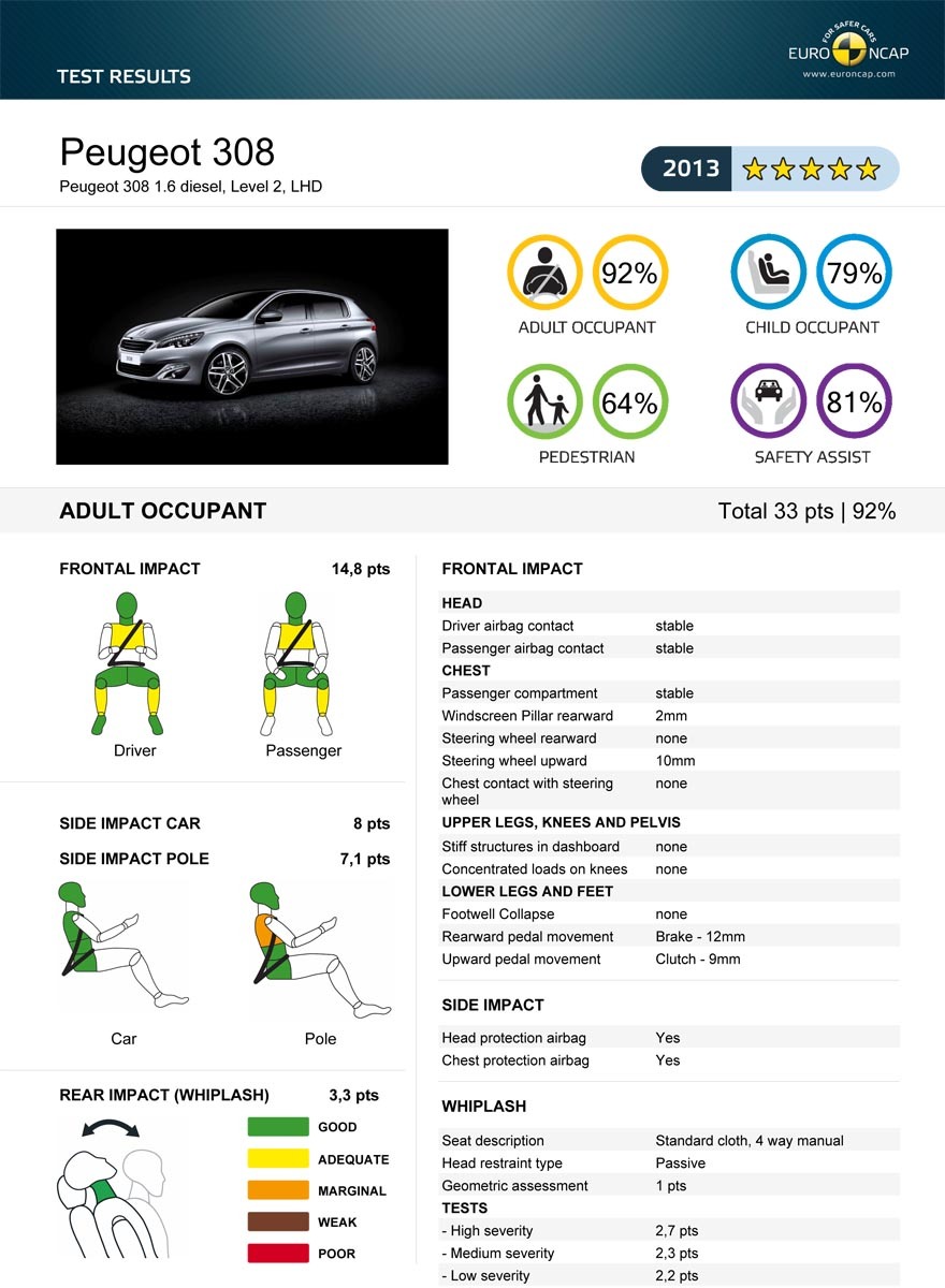 308 plăteşte un mic tribut protecţiei slabe oferite pietonilor în zona montanţilor şi la baza parbrizului (lucru valabil pentru toate modelele rivale din clasa compactă).