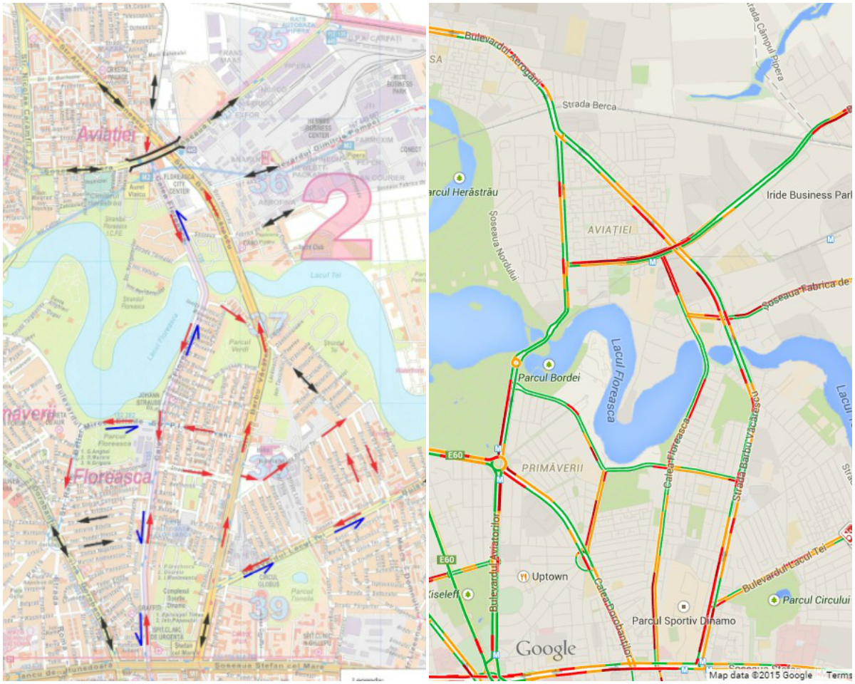 Remarcaţi diferenţa masivă între realitate şi planurile Primăriei. Sensurile unice nu rezolvă nici măcar una dintre zonele roşu-aprins (blocate) şi fluidifică traficul acolo unde el deja se mişcă decent