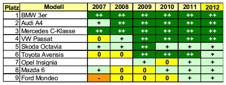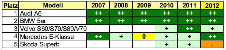Nemţii îşi continuă dominaţia prin VW Passat şi Skoda Octavia, în timp ce finalul clasamentului le revine producătorilor generalişti japonezi (Toyota şi Mazda) şi germani (Opel şi Ford). De remarcat că în nici unul dintre cazuri nu vorbim de o frecvenţă a defecţiunilor peste media clasei, maşinile de clasă medie demonstrându-se suficient de fiabile în general.