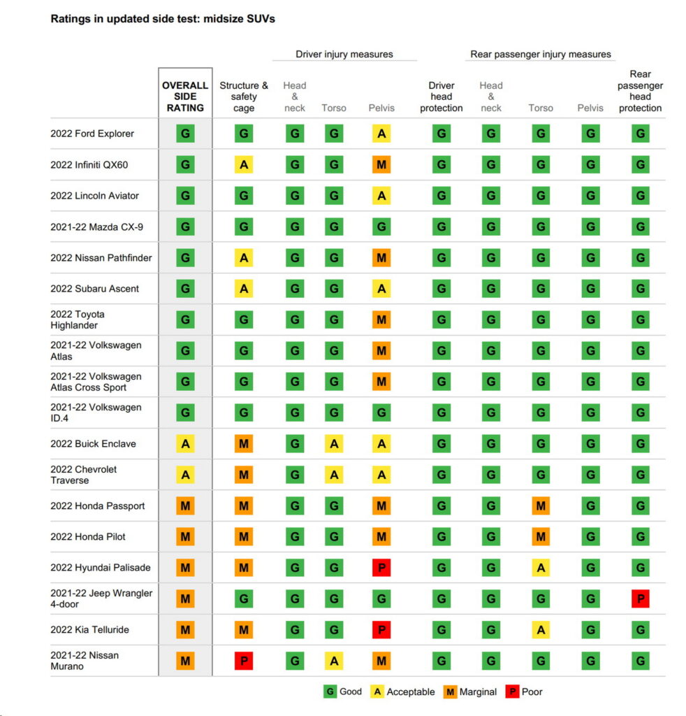 În total, 10 din cele 18 vehicule testate au obținut calificativul „Bine”: Ford Explorer, Infiniti QX60, Lincoln Aviator, Mazda CX-9, Nissan Pathfinder, Subaru Ascent, Toyota Highlander, Volkswagen Atlas, Volkswagen Atlas Cross Sport și Volkswagen ID.4, modele din 2022.