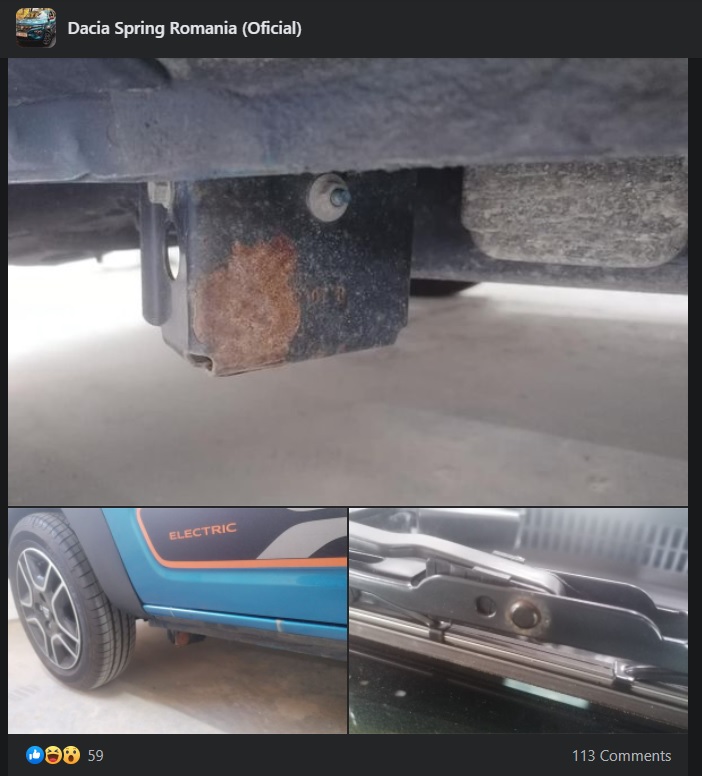 Proprietarul unei Dacia Spring a reclamat pe Facebook primele probleme apărute la mașina sa. Mai exact, bărbatul este nemulțumit de rugina care a început să apară sub mașină și la ștergător.