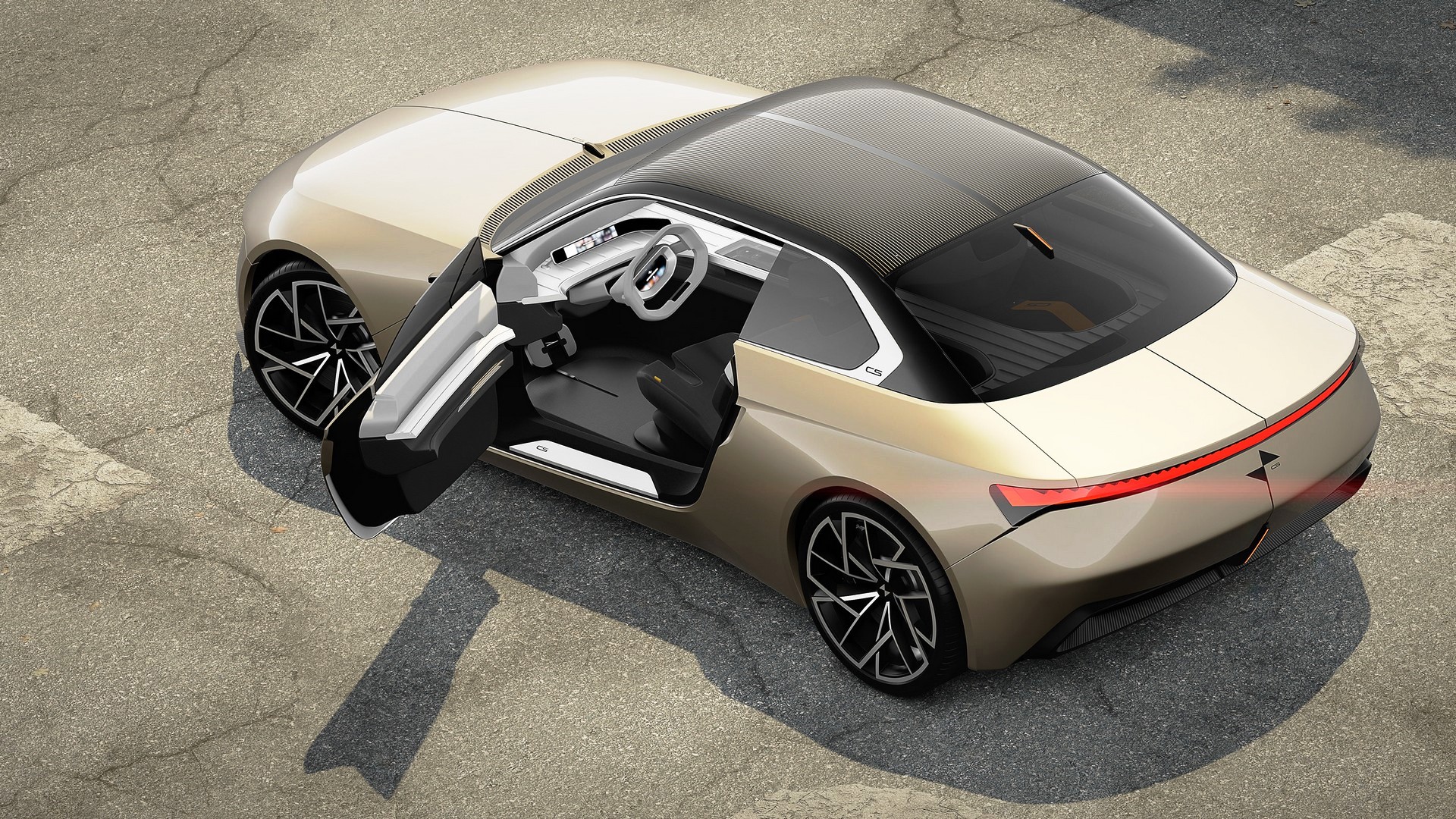 Aspectul elegant este completat de pragurile laterale minimaliste, oglinzile exterioare digitale, mânere ascunse ale portierelor, precum și de interpretarea modernă a detaliului de design Hofmeister al geamurilor laterale spate specific modelelor BMW. Totodată, plafonul se distinge prin numeroasele nervuri transversale care dau senzația de fibră de carbon.