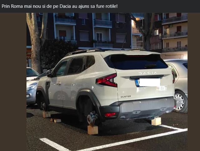 Postarea a fost însoțită de mesajul „Prin Roma mai nou și de pe Dacia au ajuns să fure roțile!”. Mașina, cu numere italiene, este parcată regulamentar, într-o zonă rezidențială, iar intervenția pare să fi fost făcută rapid și fără a avaria vizibil caroseria.