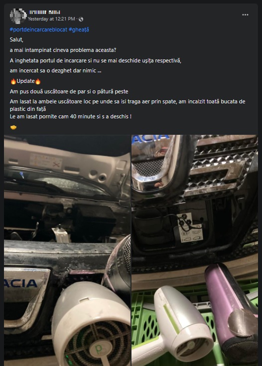 O postare care ne-a atras atenția a fost cea a unui bărbat care nu a putut să mai deschidă ușița portului de încărcare deoarece aceasta înghețase. Iată postarea de pe rețeaua de socializare: