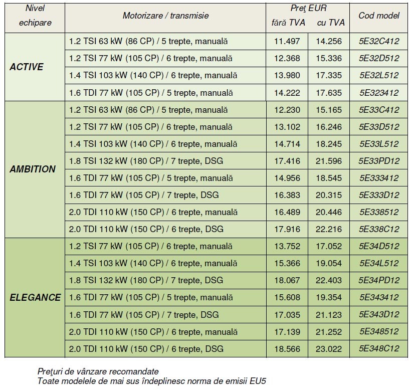 Această motorizare de bază 1.2 TSI 86 CP e disponibilă şi în echiparea superioară Ambition, la 12.230 euro fără TVA (15.165 euro cu TVA inclus), plusând faţă de Active cu jante din aliaj, proiectoare de ceaţă, volan şi schimbător îmbrăcate în piele sau cotieră faţă.