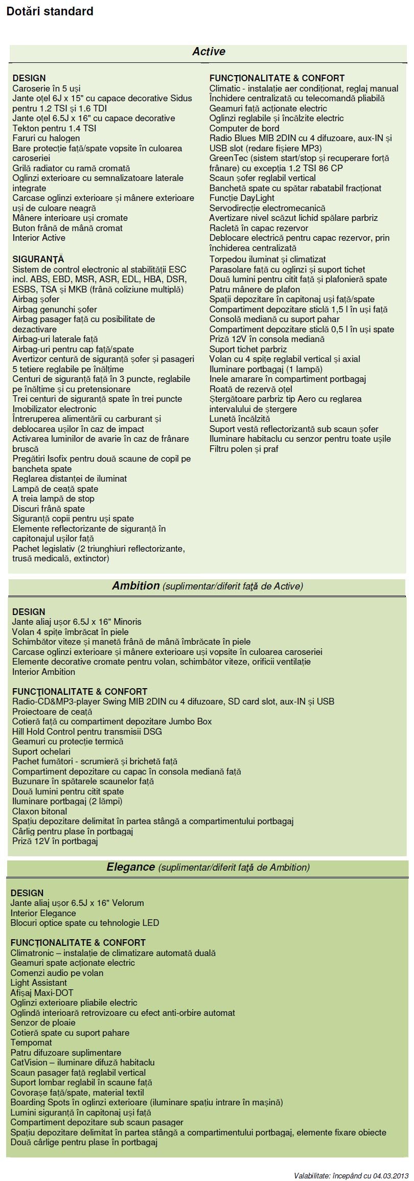 Mai jos, lista de dotări standard pentru Skoda Octavia: