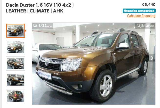 De la un producător nipon trecem la unul autohton. În topul nostru vă prezentăm și modelul Duster de la Dacia. Cel găsit pe Mobile.de a avut prima înmatriculare în 2010, în timp ce rulajul este de aproximativ 168.000 de kilometri.