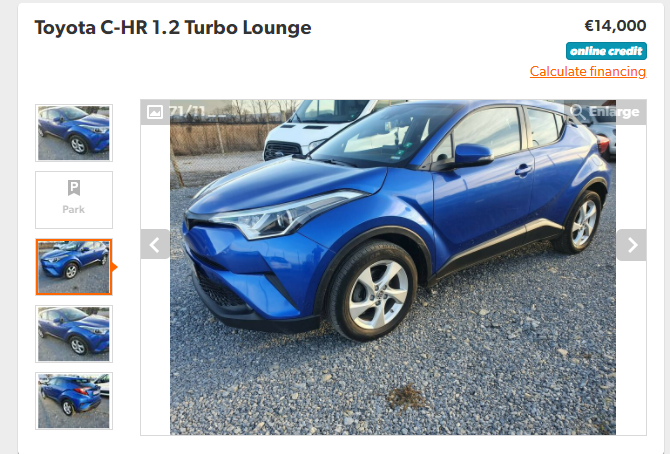 Cel mai scump model din această listă este un model C-HR de la Toyota. Un SUV crossover ceva mai nou, care a fost înmatriculat prima dată în 2018. Rulajul mașinii este unul foarte bun – 55.000 de kilometri.