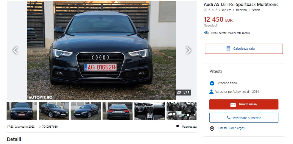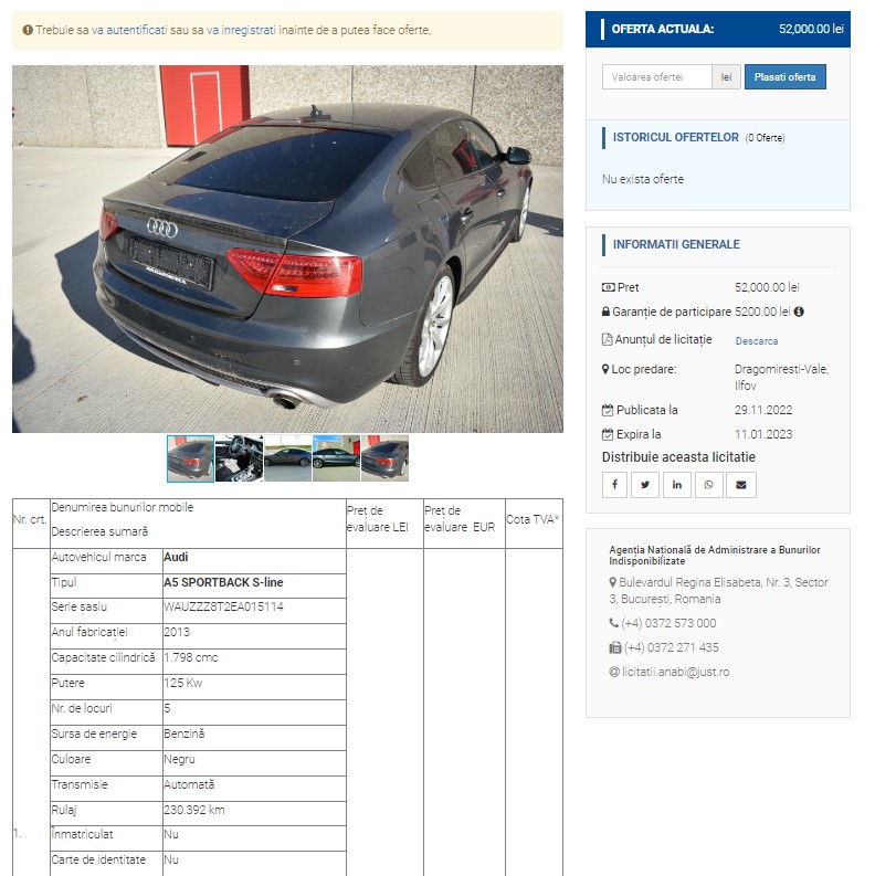 Este și exemplul unui Audi A5 Sportback S-line din 2013, care la licitația din 5 ianuarie a.c. este listat la un preț de 10.500 de euro sau 52.000 de lei, la care nu se aplică TVA. Autoturismul cu cinci locuri are deja un rulaj de peste 230.000 de kilometri. Interiorul este realizat din piele și textil, iar culoarea de la exterior este metalizată.