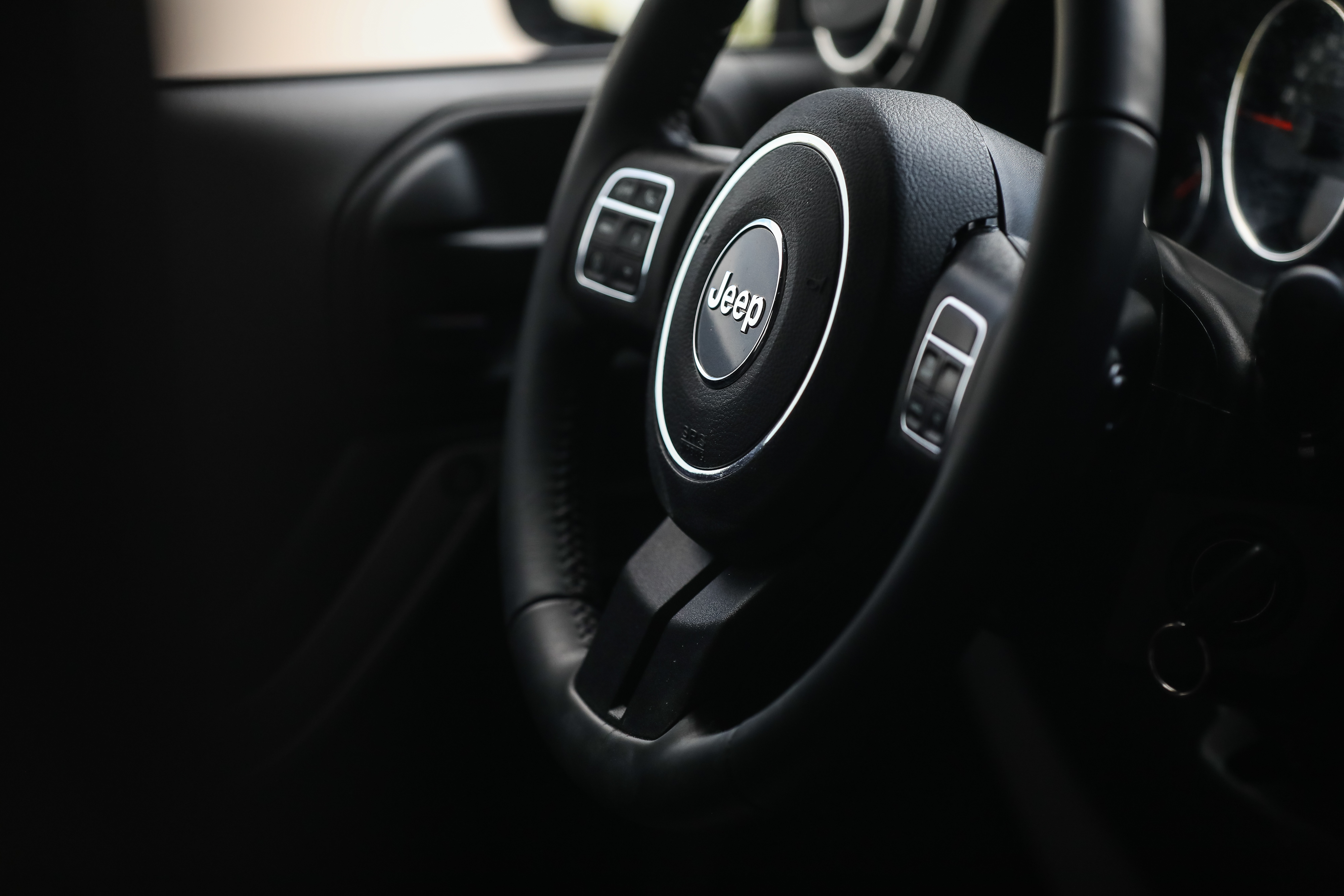 La interior te întâmpină un bord foarte simplu organizat. Există patru guri de ventilaţie, două pe laterale şi două în centru, un volan îmbrăcat în piele, reglabil pe înalţime, un spaţiu de depozitare pe bord, butoanele pentru geamurile electrice între gurile de aerisire şi un mâner de prindere în dreptul pasagerului din dreapta. Wrangler este dotat în standard cu un interior rezistent la apă, dotat cu orificii de scurgere.
