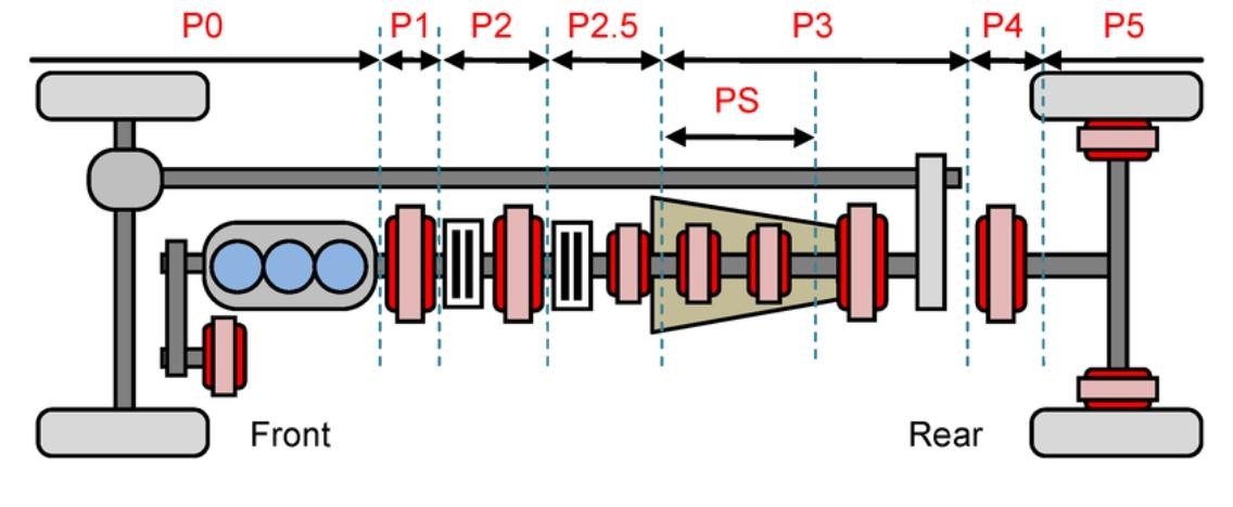 P0 presupune un motor generator, să-l numim motor electric, amplasat pe cureaua de accesorii a motorului termic, împreună cu posibile anexe precum compresorul AC, pompa de apă, etc.