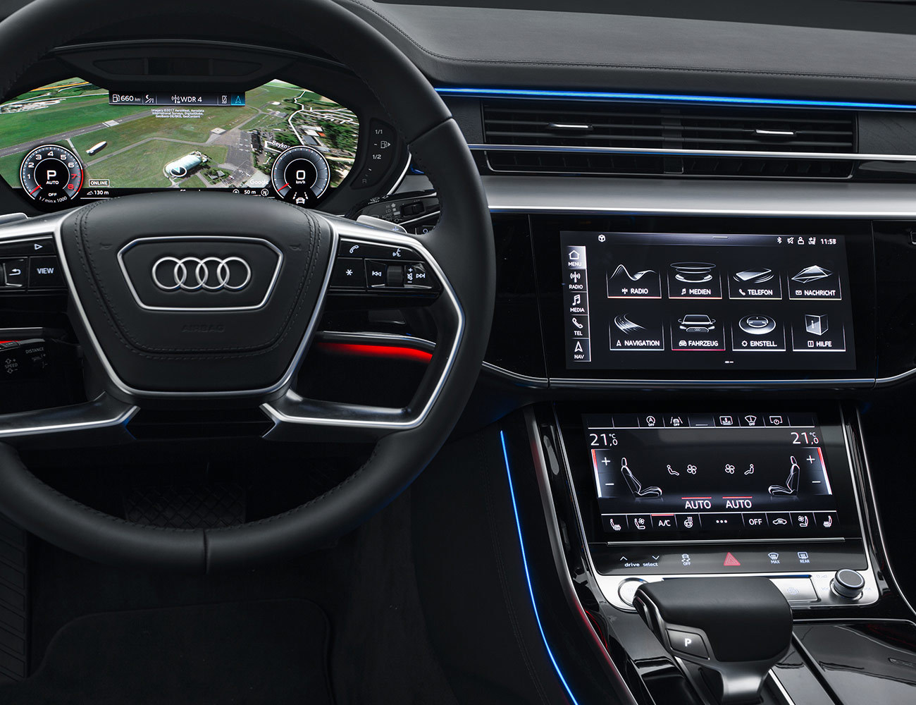 Interfaţa MMI de la Audi este una dintre cele mai bune din domeniu. Dotată cu touchpad-uri inteligente, o grafică foarte plăcută şi un cockpit virtual care permite personalizarea în funcţie de preferinţele oricărui şofer. Maparea 3D bazată pe hărţile Google oferă un context excelent atunci când navigaţi în medii noi, în special în oraşe. Comenzile vocale pot fi de ajutor. Sistemele Audi includ o listă de 30 de comenzi pe care le puteţi introduce vocal.
