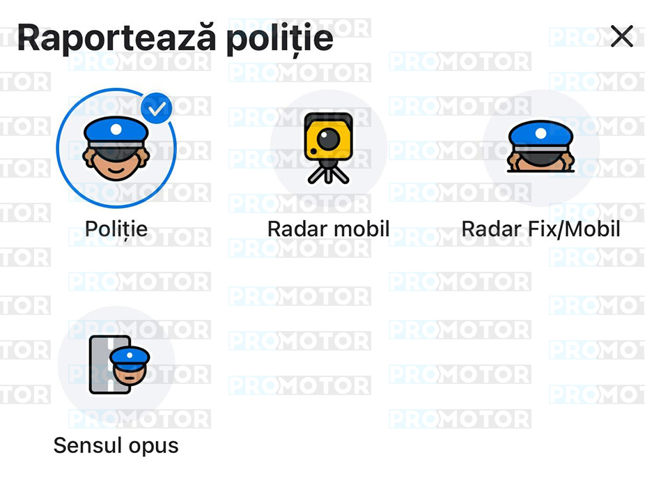 Poliție: Această opțiune este utilizată pentru a indica un echipaj de poliție vizibil, de regulă aflat pe marginea drumului, într-o zonă de supraveghere sau control. Poate fi vorba despre un filtru rutier, o verificare de documente sau o patrulă în mișcare.